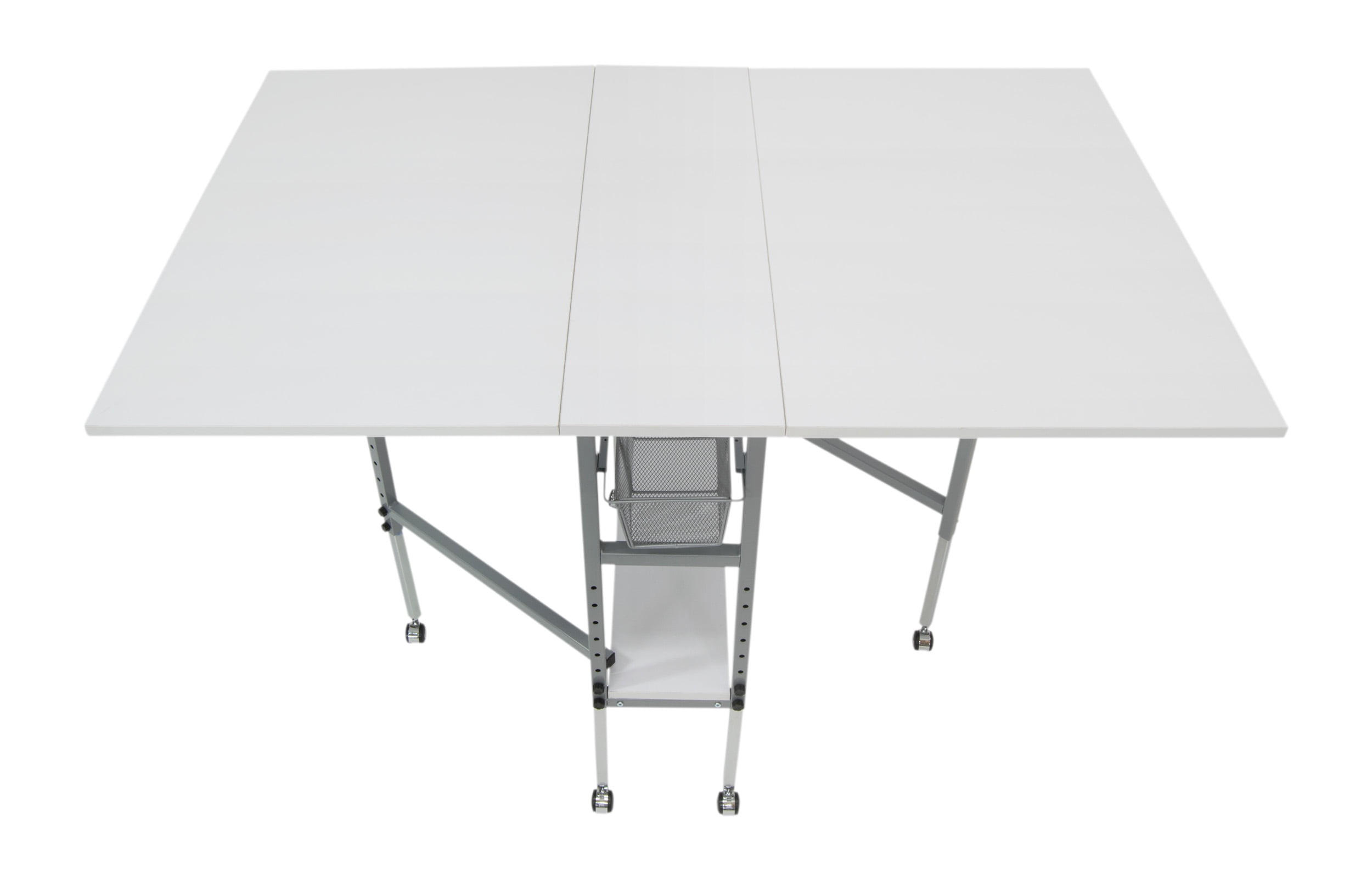 Studio Designs Sew Ready Mobile Folding Height Adjustable Quilting Fabric Cutting Table With Grid Top And Storage In Silver White 13386
